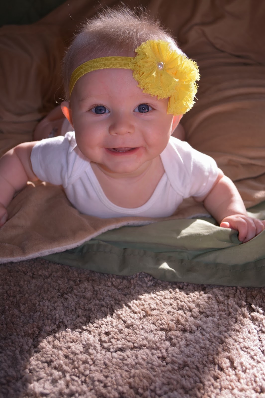 | My Favorite! The smile, the pose, and that you can see her little 6 month sticker. I wish the "lighting" were better. But, I guess you can't win them all. I am not to that part in my class yet! |