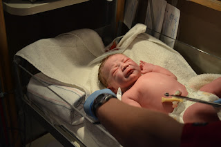 He was put right on my chest and I didn't look away like I did with Tess. I was braver and watched all I could see from my perspective. As the doctor was delivering him, she said he had a big head and was a big baby. So were the nurses and techs! When they put him on my chest, he looked like a tiny little thing to me! But to everybody else he was huge! I guess it was obvious that I am not around newborns often. The doctor wanted to know where I hid an almost ten pound baby, I think she was surprised but then recalled that on our 33 week ultrasound he was measuring big. That wasn't the only time he measured big, his original due date from my LMP was March 13th. He was over a week ahead at such an early stage of pregnancy that they moved it up to March 5th. Then measured big again, so it will be interesting to see how he grows from here on out. I wonder if he will continue to be big.